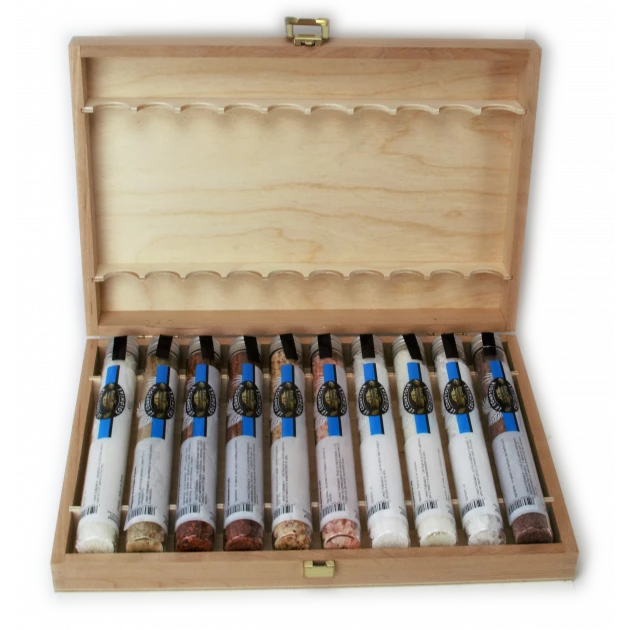 Faites plaisir à tous les coups grâce au Coffret Cadeau 10 Sels Le Comptoir Colonial. Chaque sel est présenté dans un tube en verre et se trouve enfermé dans un élégant coffret en bois.