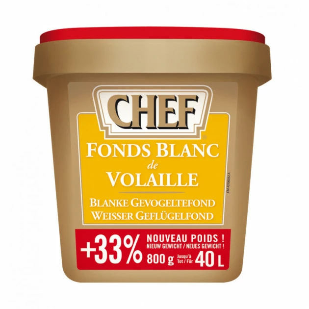 Fonds blanc de volaille : Base pour velouté de volaille et sauce crème, cuisson de légumes et de féculents, fricassées de volaille.