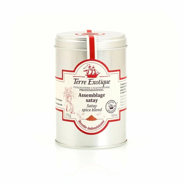 Mélange d’épices à la couleur orangée et aux arômes riches, le mélange satay vous procure des saveurs nouvelles pour votre cuisine. Cet assemblage de crevettes, de tomates, cacahuètes et de bien d’autres épices complémentaires se marie à la perfection avec des poissons, des grillades, et des gambas. Facile à incorporer dans une marinade, l’assemblage satay offre un mélange de sucré, salé et de piment qui réveillera les papilles de vos convives.