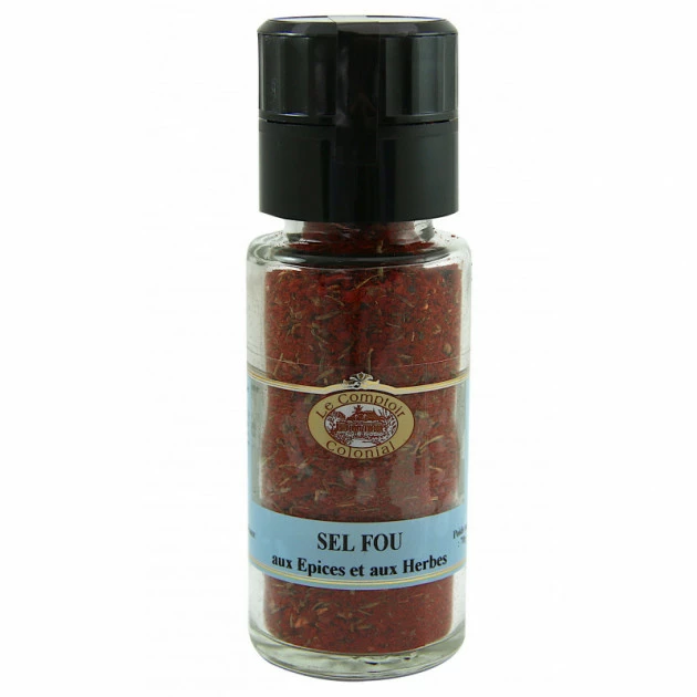 Le nom “Sel Fou” provient du fait que cet assaisonnement se compose d’un très grand nombre d’ingrédients : poivre, paprika, chili ou encore romarin…